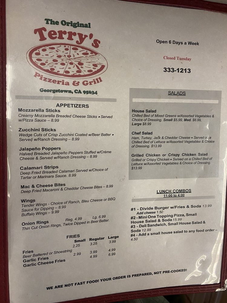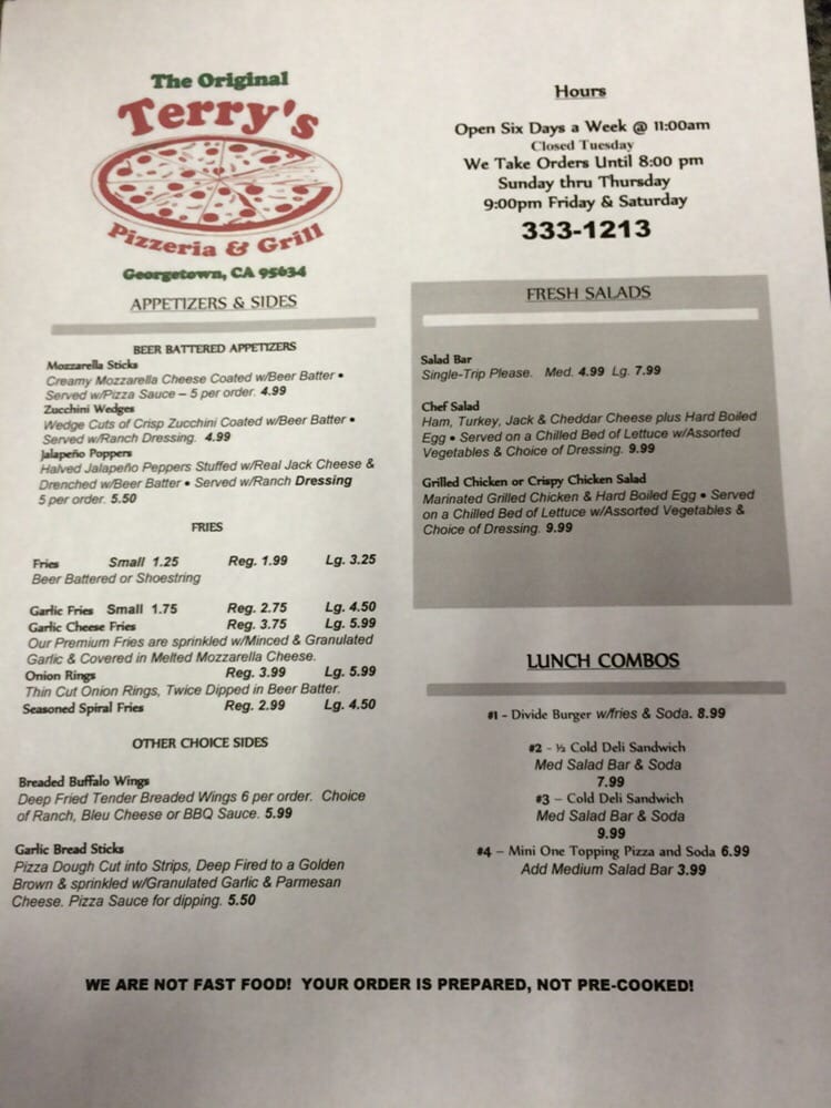Introducing Terry’s Pizzeria & Grill, a community favorite located at 6274 State Hwy 193 Georgetown, CA. This casual spot offers takeout, delivery, and outdoor seating, making it a versatile choice for a meal. With a menu featuring many vegetarian options and beer & wine selections, Terry’s caters to a variety of preferences. Customer reviews rave about the delicious pizza, gluten-free crust, and hearty breakfast options like country fried steak and eggs. The friendly service and quick turnaround time ensure a pleasant dining experience every visit. Make sure to try the Hawaiian pizza with jalapeños for a spicy twist and savor the crispy hash browns. Stop by Terry’s for a warm atmosphere and satisfying dishes that keep the community coming back for more.